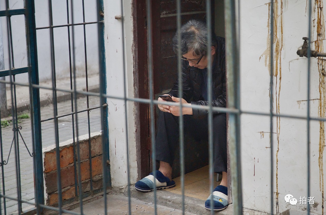 △ 4月6日,得胜桥老街上,一位居民坐在家门口刷手机。