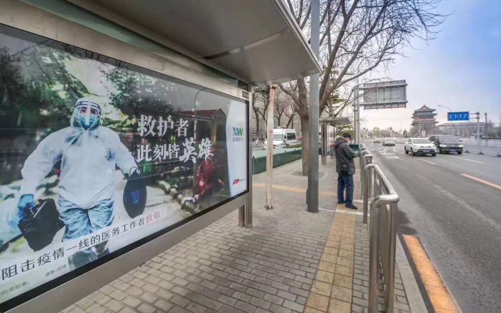北京前门公交站台,海报画面主角是29岁的武汉护士邱琳玉。当时,邱琳玉接运患者时,奋力冲向急救车,这一瞬间恰好被抓拍。 受访者供图