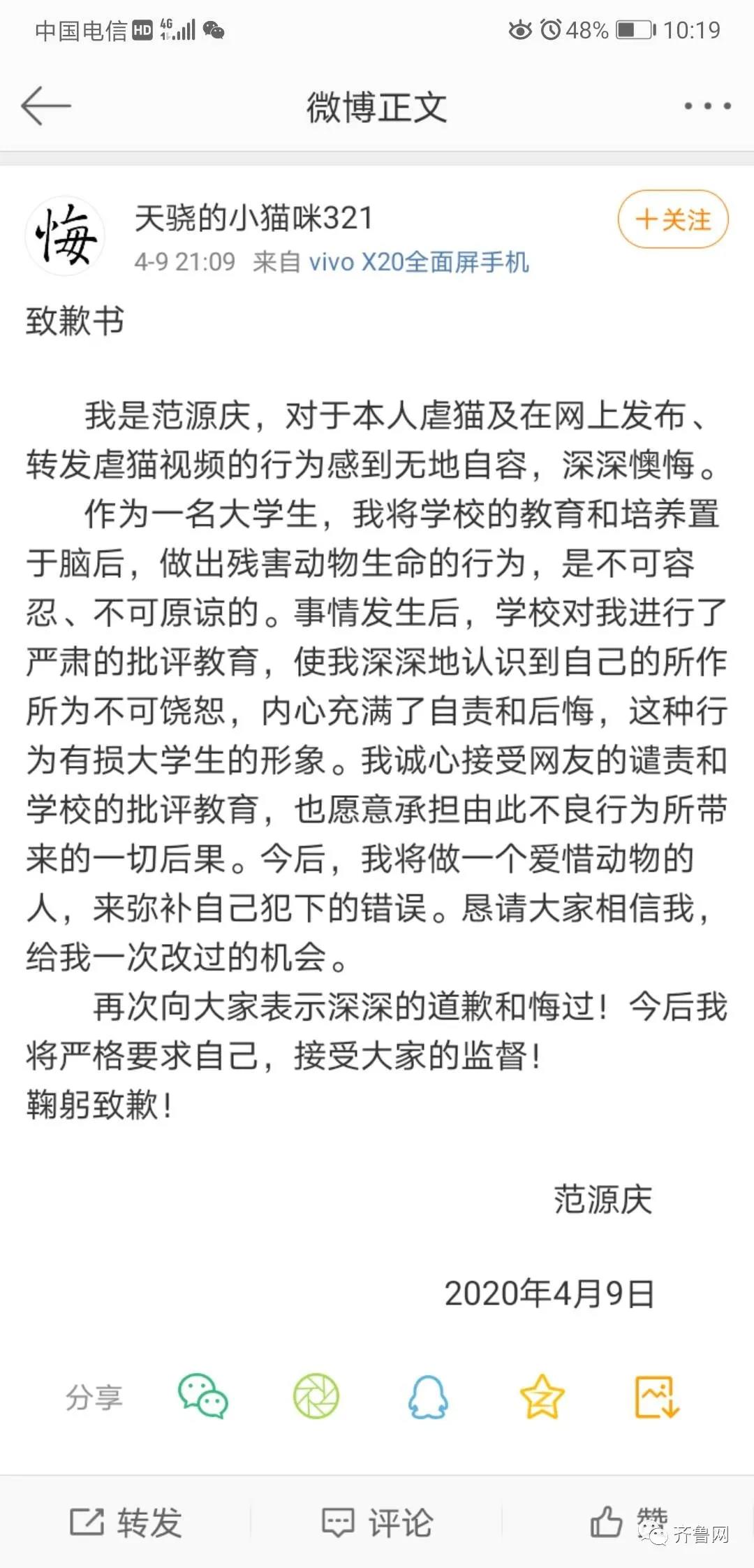 发布并贩卖虐猫视频 山东理工大学涉事学生发文致歉