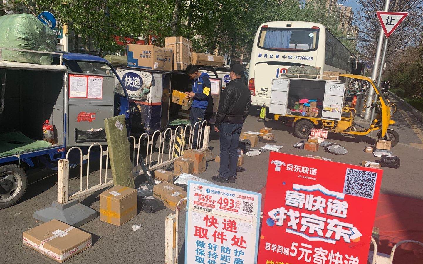 朝阳区华腾园小区,目前仍然不允许快递进入小区,快递员还只能在门口“摆摊”。摄影/新京报记者 陈琳