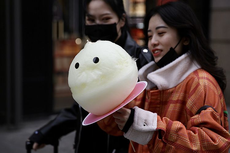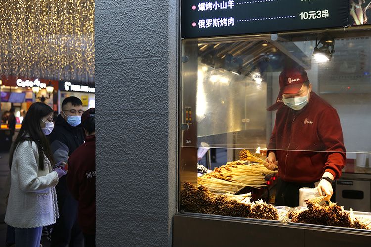 楚河汉街,一家烤串店外,市民等待领取外带食物。