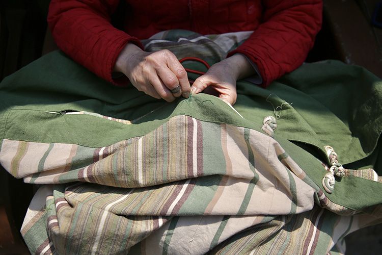 武昌区西厂口社区,一位居民坐在家门口,边晒太阳边缝被子。