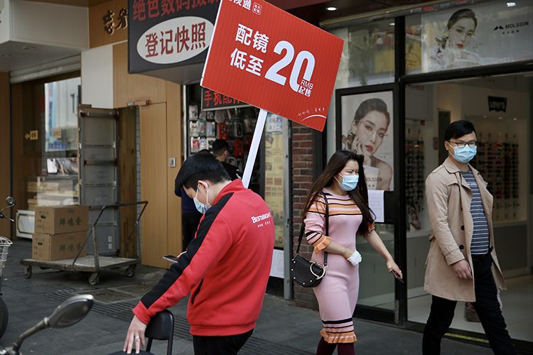 武昌区西厂口社区外,一家眼镜店的店员举着促销牌招揽生意。