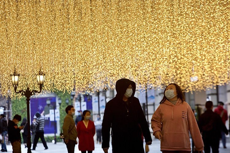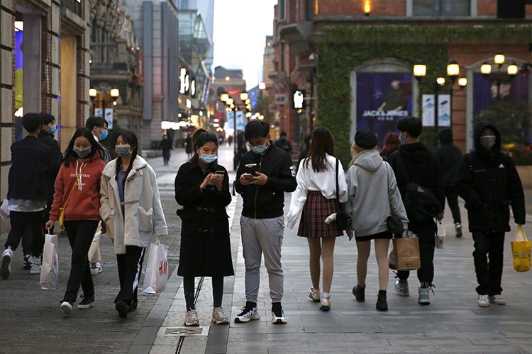 4月11日晚,在武汉市武昌区著名的楚河汉街上,穿着时尚的年轻人,拎着大包小包满载而归。商业街街口,一辆辆复工的出租车在路旁等待客人。