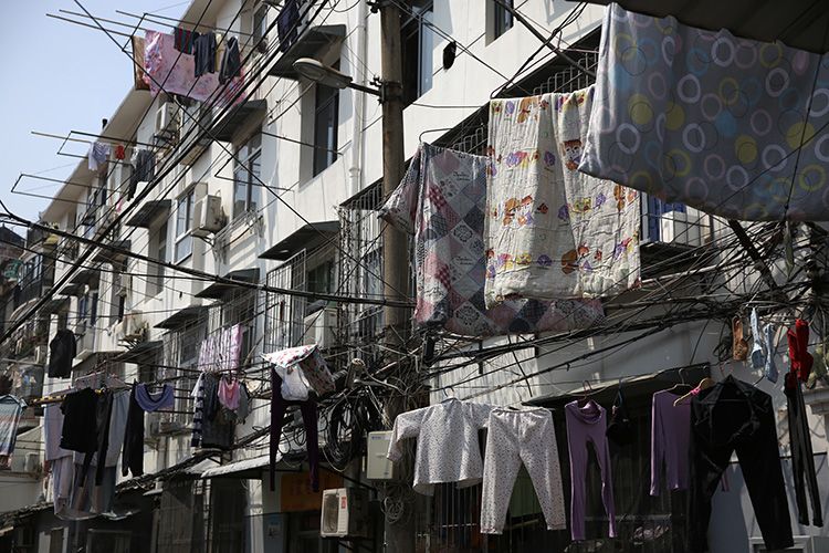 武昌区西厂口社区,居民趁周末天气晴朗,在巷子里晾晒衣被。