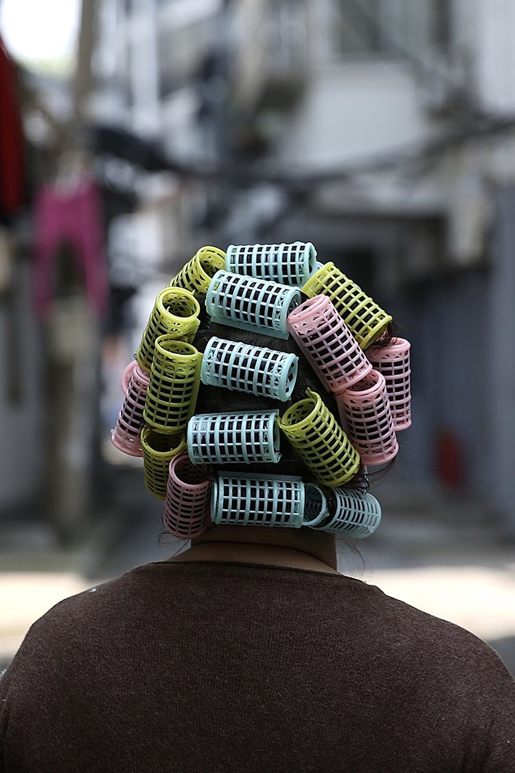 武昌区西厂口社区,一位女士头上挂满卷发筒。