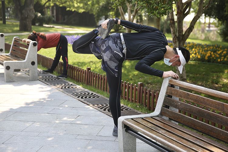 东湖生态旅游风景区,准备跑步的市民正在绿道边做拉伸运动。