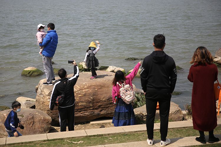 东湖生态旅游风景区,很多家长带着孩子在水边嬉戏。
