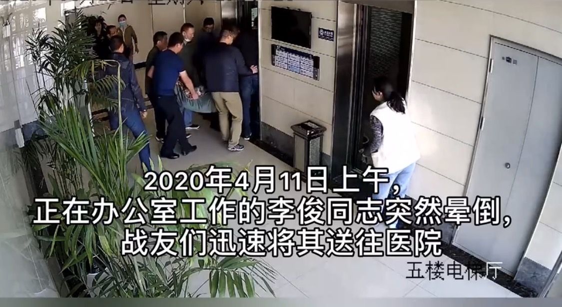 李俊晕倒后多名同事将其送往医院。警方供图