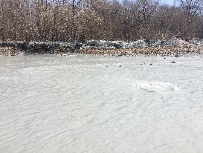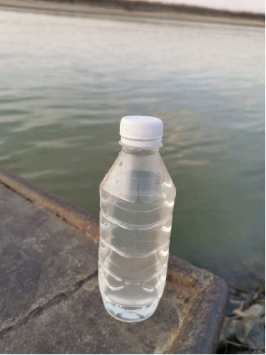 4月10日18:00,在兰西桥投药点下游3公里处,生态环境部工作组专家取样发现,河水清澈,不见明显絮体。图源:生态环境部