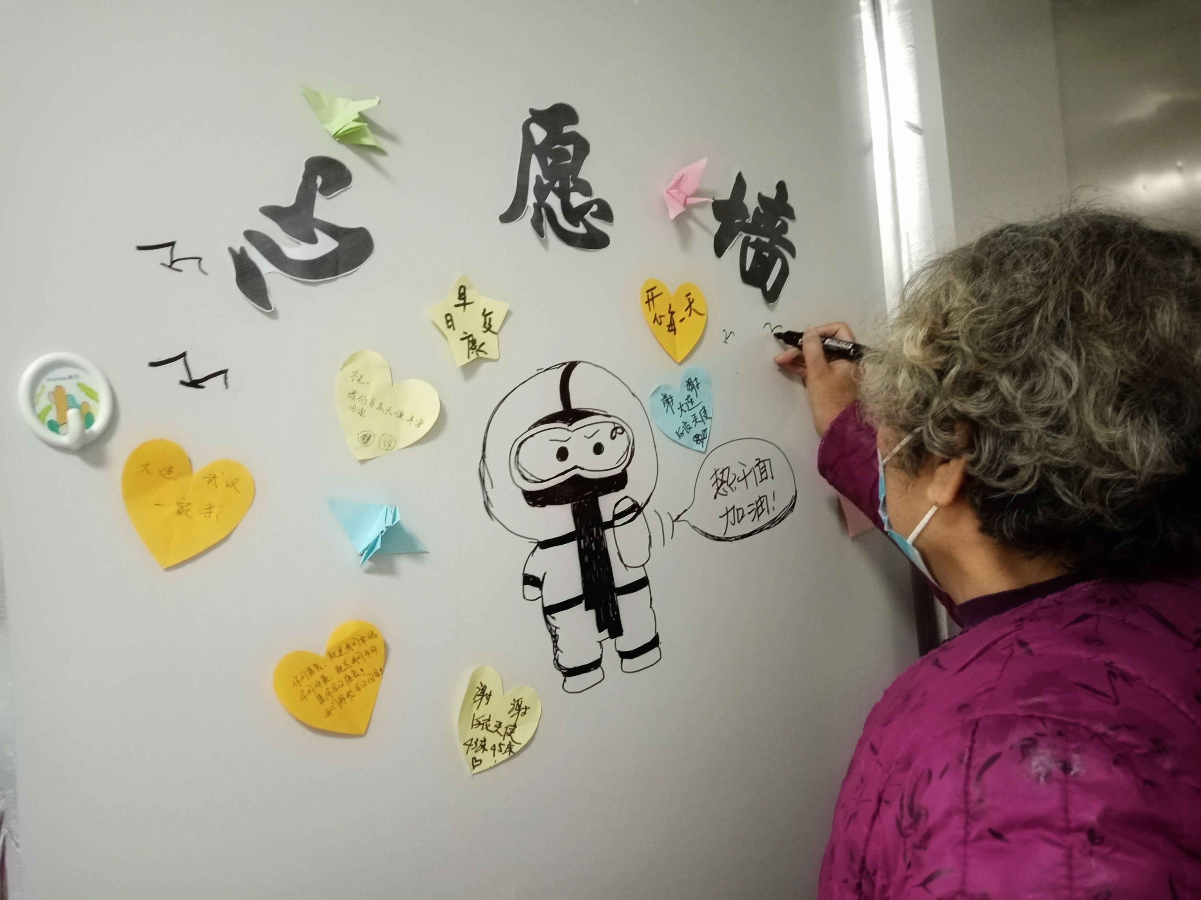 为了鼓励患者、帮他们放松心情,从3月起,刘玉和医护人员开始在患者病房外的通道内作画。有时,她会把画笔交给患者,请他们画下自己喜欢的东西。有位阿姨和刘玉一起画了海鸥,更多的人选择在“心愿墙”上写字:“谢谢大连白衣天使”、“早日康复”、“大连武汉一家亲”……