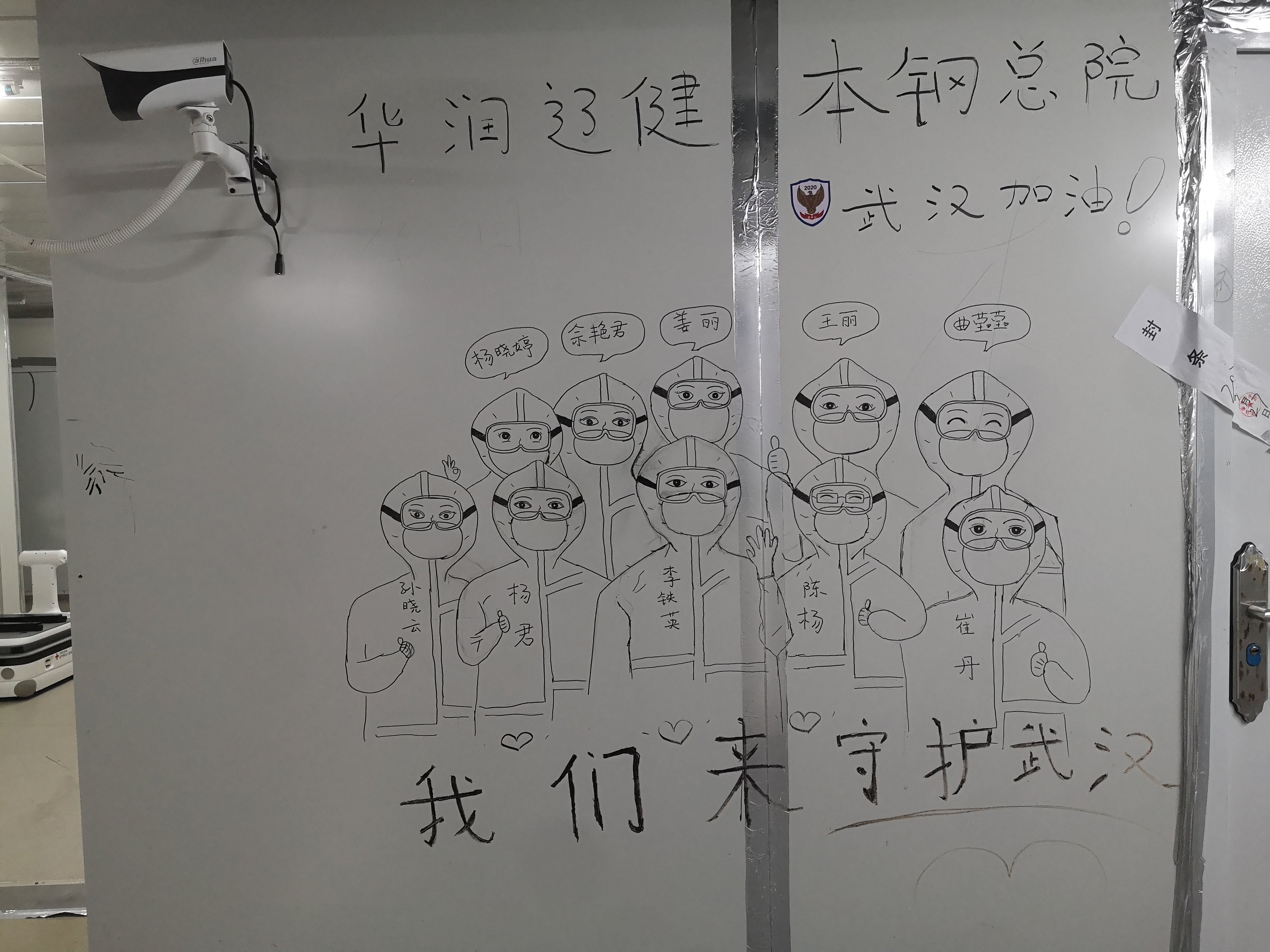 更多的涂鸦,是穿戴着防护服、护目镜和口罩的医护人员,画中的防护服上写着各人的名字。还有一幅钟南山的简笔画肖像,旁边写着:武汉是英雄的城市,武汉人民是英雄的人民。这是钟南山说过的话。
