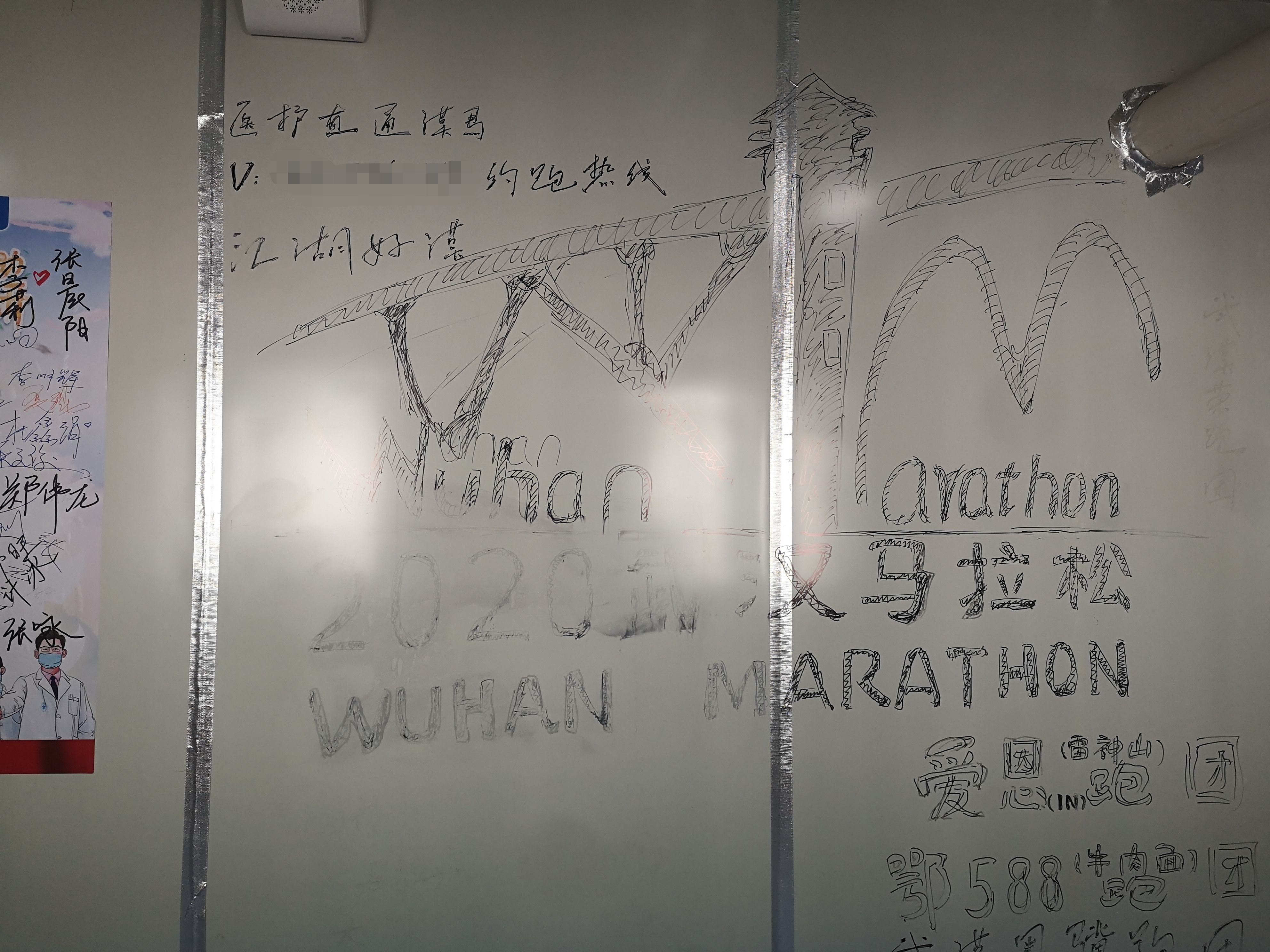 3月中旬,周汉华也在涂鸦墙上留下“大作”,与马拉松有关:在线条勾勒的长江大桥下,他写下了“2020武汉马拉松”。