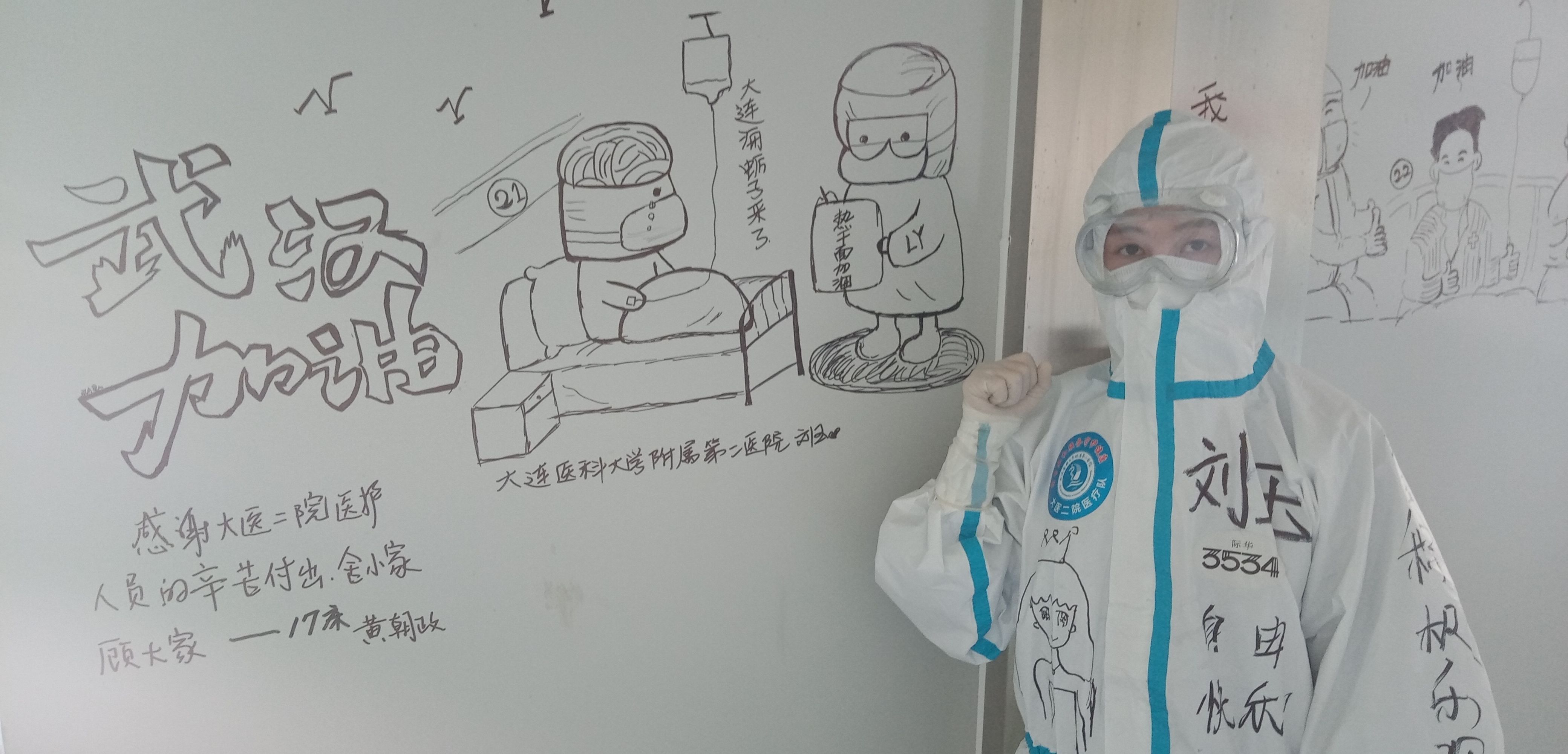 来了半个多月,超强度的工作、超强度的心理压力,让刘玉有些崩溃。想到以前在学校办黑板报时,同学们会写下很多鼓励的话,刘玉也想试一试。2月25日,她拿起了那支在防护服外写名字的马克笔,在医护通道空空荡荡的白墙上,她画起了涂鸦。