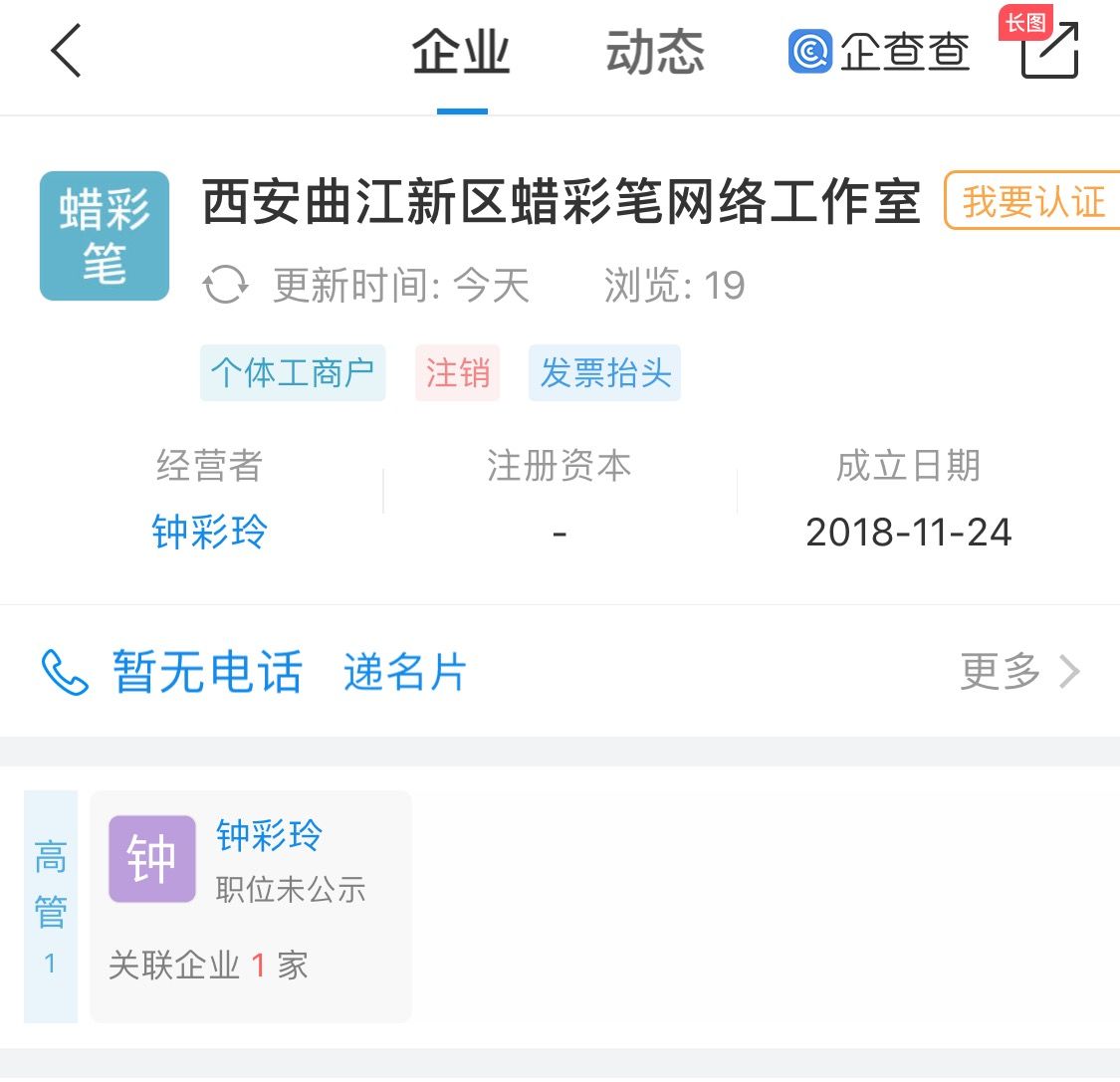 涉事工作室的经营者指向“钟彩玲”,但其未公开电话及注册资本,仅显示工作室成立日期为“2018年11月24日”。