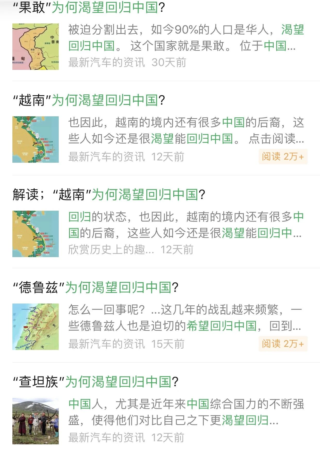 新京报记者注意到,“xxx为何渴望回归中国”系列文章涉及多个国家和地区,除了标题雷同,内容方面还出现了复制、拼贴去年网络文章等情况。