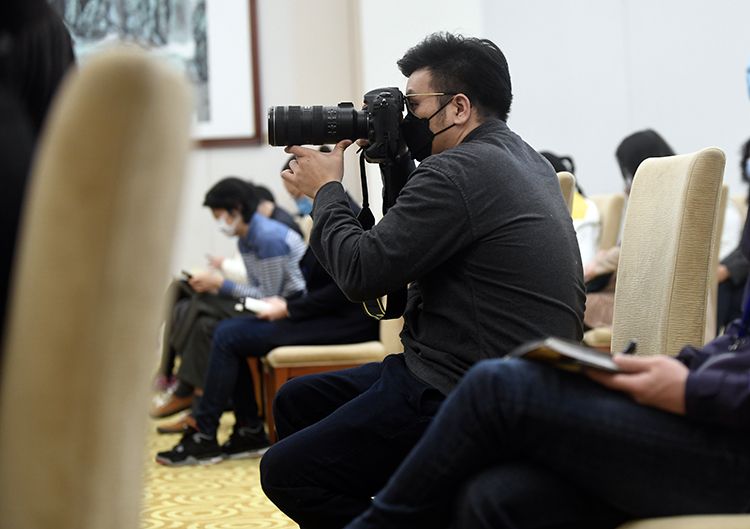 发布会上记者采访。