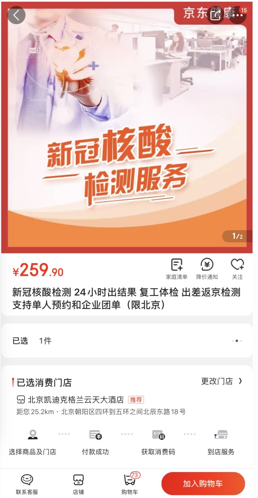为了给外地返京人员提供更加便捷的服务,京东健康联合北京金域医学实验室,第一时间上线核酸检测在线预约服务。北京金域医学实验室是北京市卫健委公布的面向团体和个人提供新冠病毒核酸检测的官方指定机构之一,目前在北京设有2个检测采样点,分别位于朝阳区北京凯迪克格兰云天大酒店、海淀区北京泰富酒店。进京人员均可通过京东APP提前购买检测服务并预约检测采样;采样完成后,24小时内即可获取检测结果报告。
