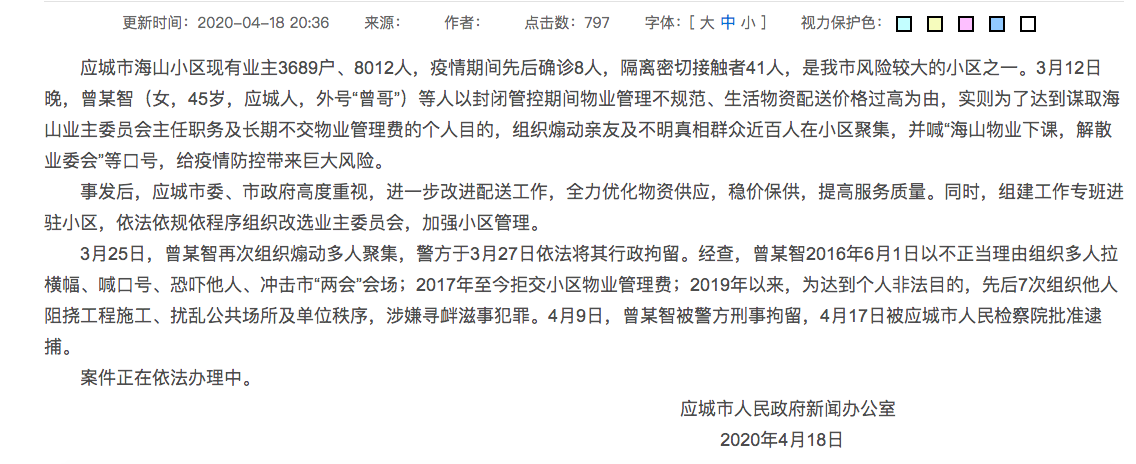 新京报快讯 据应城市政府消息,应城市海山小区现有业主3689户、8012人,疫情期间先后确诊8人,隔离密切接触者41人,是我市风险较大的小区之一。3月12日晚,曾某智(女,45岁,应城人,外号“曾哥”)等人以封闭管控期间物业管理不规范、生活物资配送价格过高为由,实则为了达到谋取海山业主委员会主任职务及长期不交物业管理费的个人目的,组织煽动亲友及不明真相群众近百人在小区聚集,并喊“海山物业下课,解散业委会”等口号,给疫情防控带来巨大风险。
