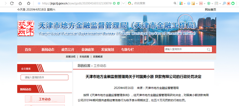 新京报讯(记者 黄鑫宇)近日,天津金融监管局对辖区内国美小额贷款有限公司(下称“国美小贷”)、天津皕信商业保理有限公司(下称“皕信商保”)两家机构,开出合计70万元的罚单。其中,4月16日国美小贷因存在“提供虚假经营信息”行为,天津金融监管局责令其限期改正并处罚50万元。这也是自4月8日以来,天津金融监管局连续开出的第四张罚单。