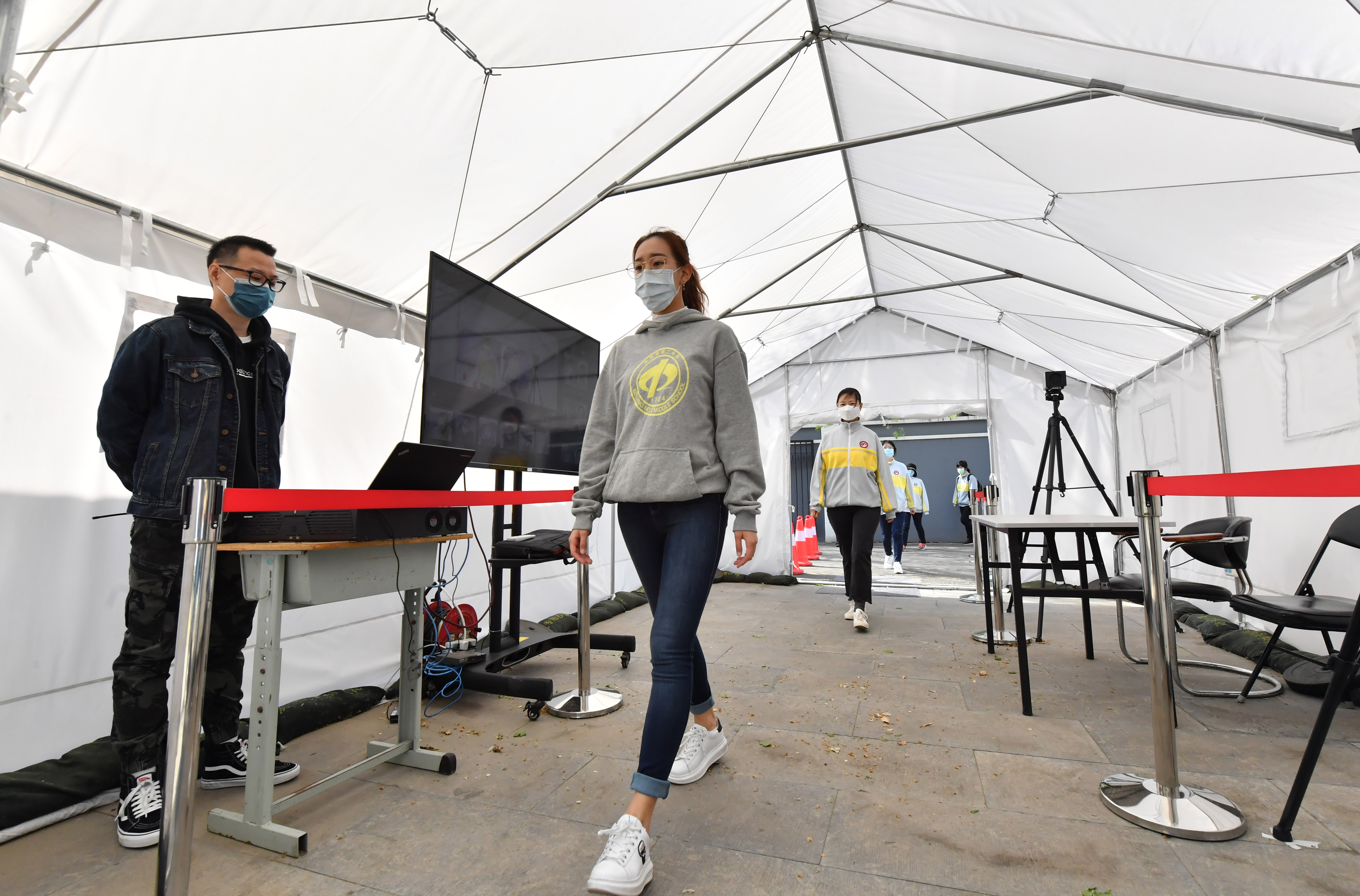 进入学校前,学生要先在学校所在的内务部街胡同进行第一次测温。4月20日上午8点40分,北京二中高三年级开学工作全流程演练正式开始。