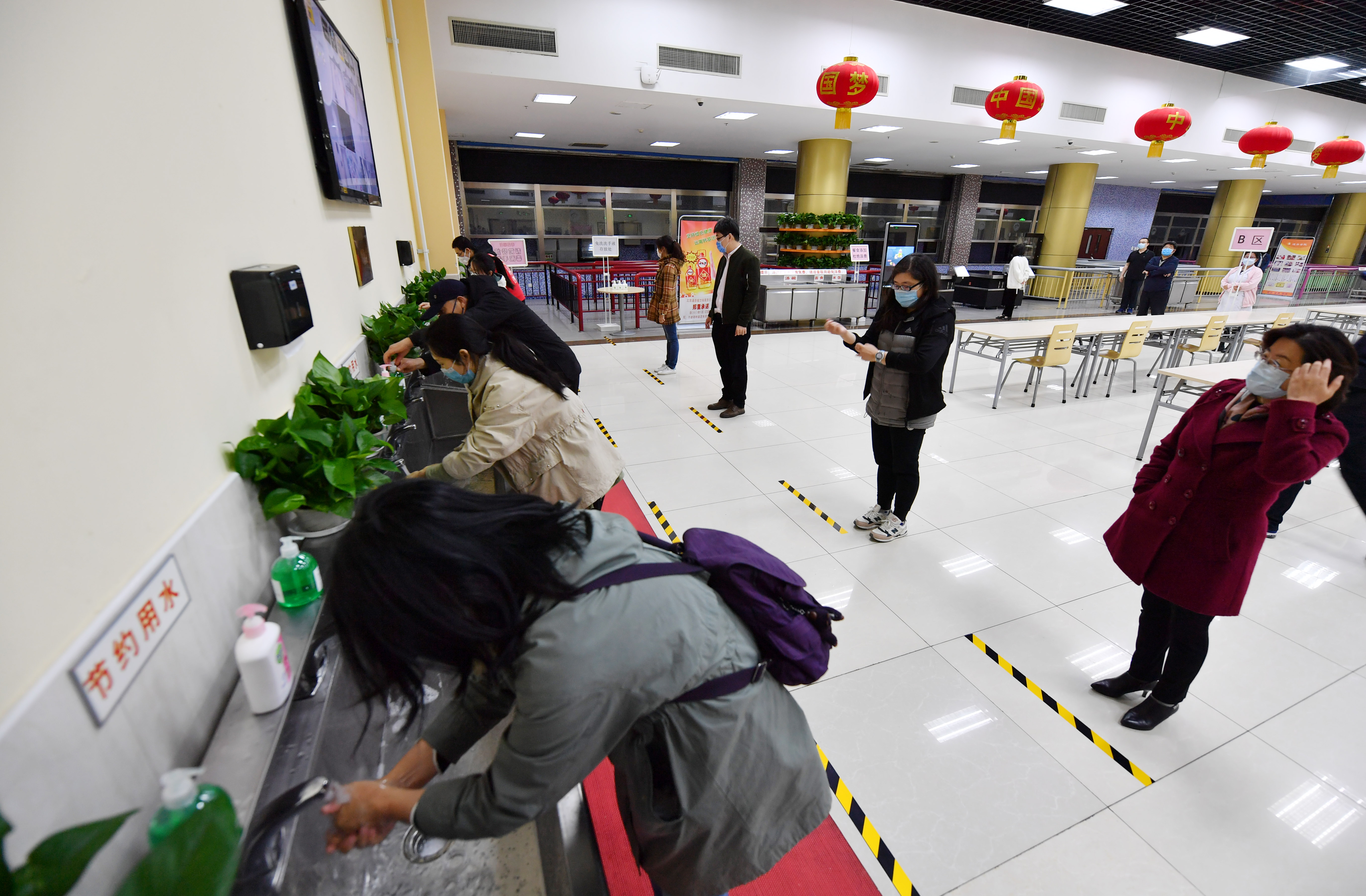 北京二中采取按性别分批错峰就餐策略。“我们将食堂分为了A、B区,实行一人一桌,学生同向就座。”北京二中副校长许柬介绍。就餐前,有工作人员引导“学生”严格按照七步洗手法洗手消毒,按照指示路线保持一米距离有序排队取餐。