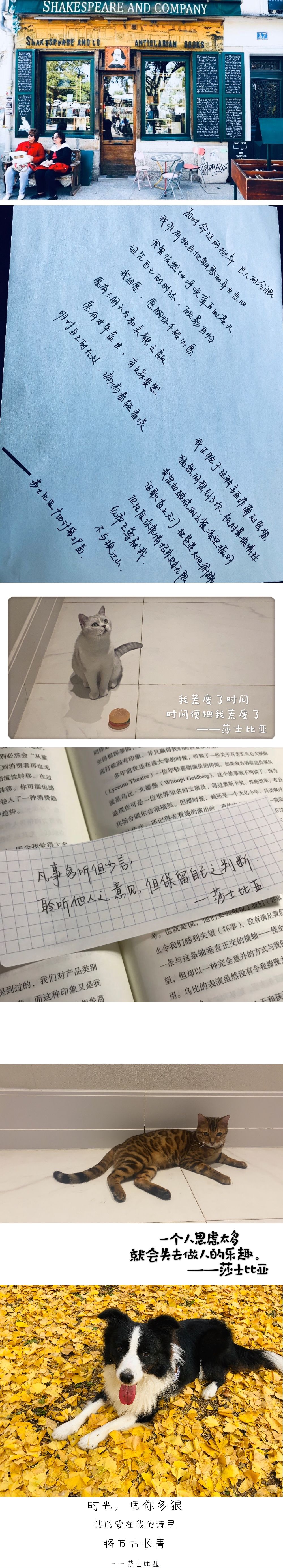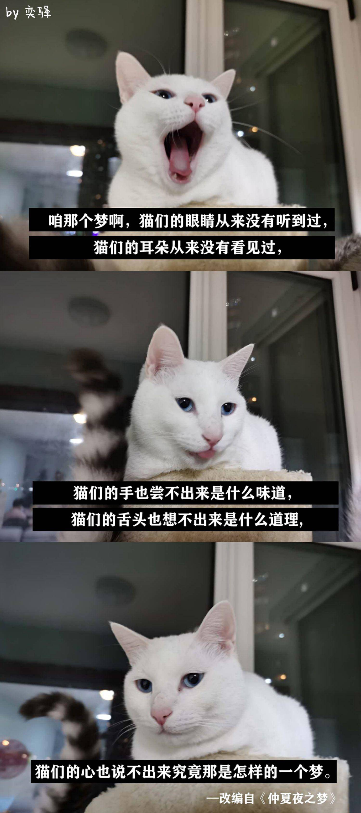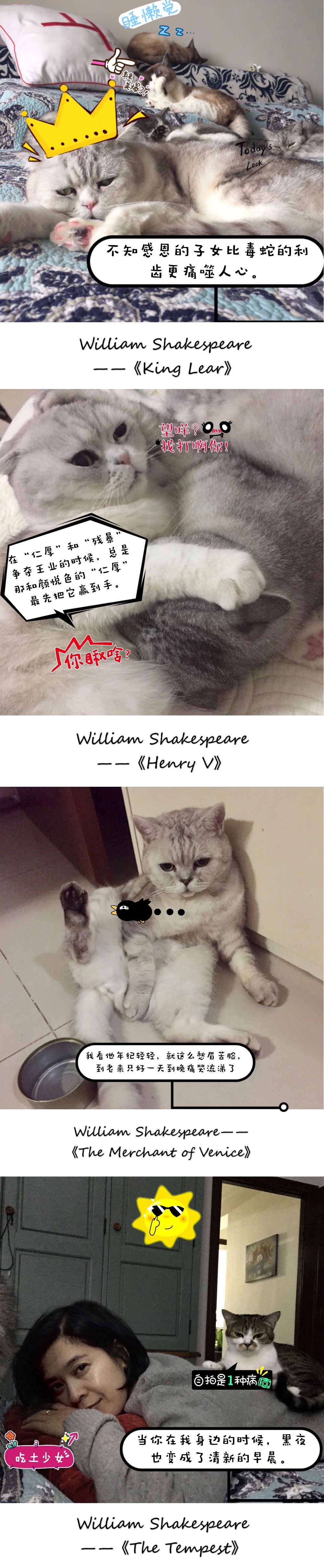 作品简介:为致敬莎士比亚,我们改编了著名的四大喜剧(《仲夏夜之梦》、《皆大欢喜》、《威尼斯商人》、《第十二夜》)与四大悲剧(《哈姆雷特》、《奥赛罗》、《李尔王》、《麦克白》)的经典台词,特邀奕驿老师家里的猫咪淘淘、方方、墩墩、格格,以及文婷老师家的猫咪菜碟、Eliot倾情出演。
