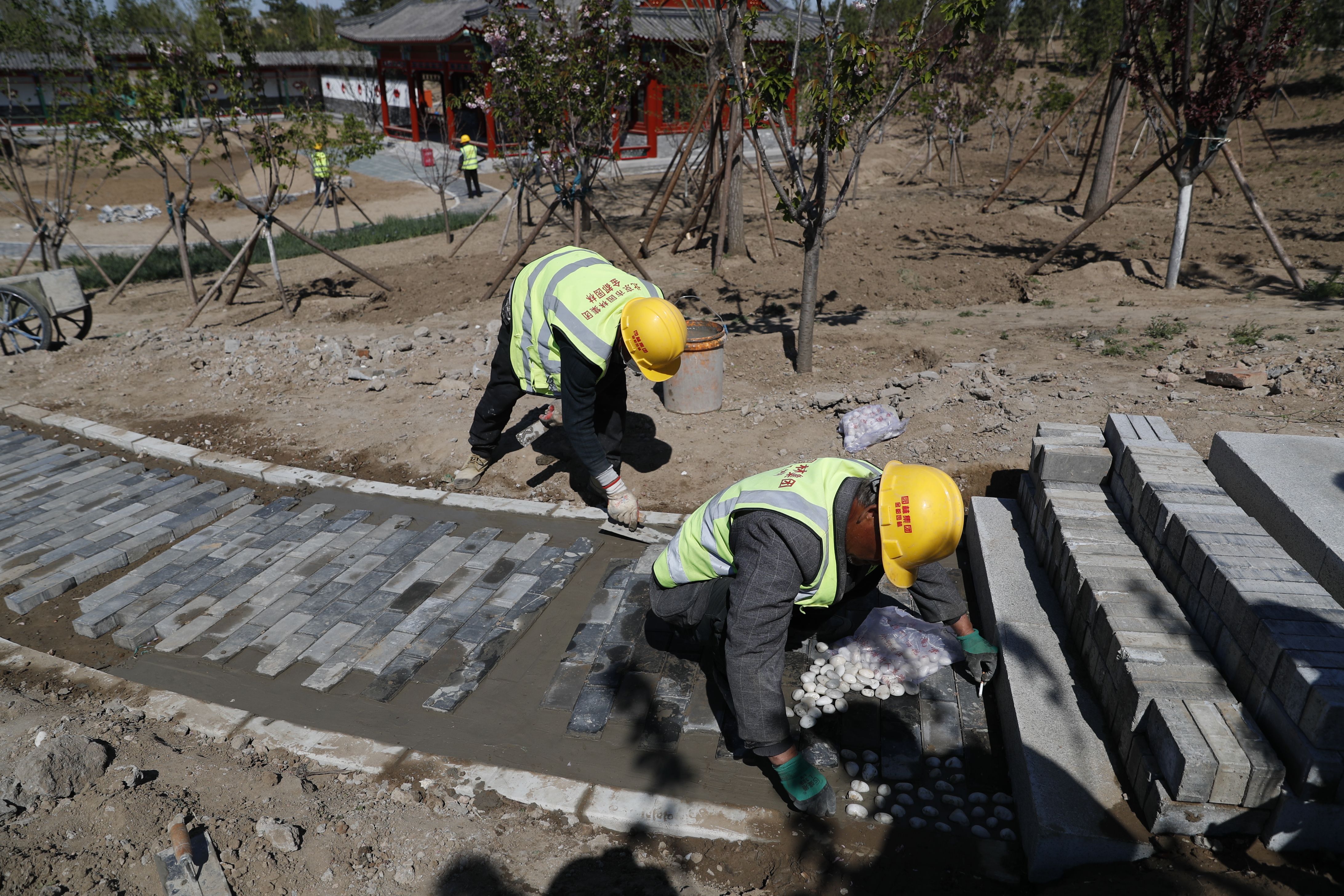 工人在园内铺设道路。新京报记者 侯少卿 摄