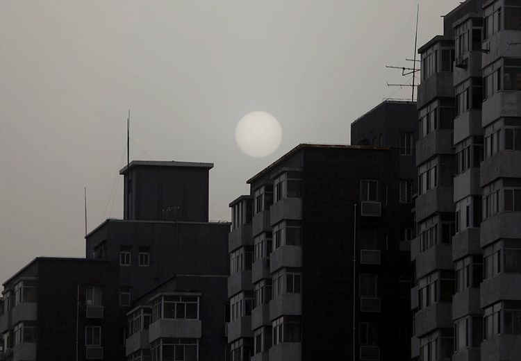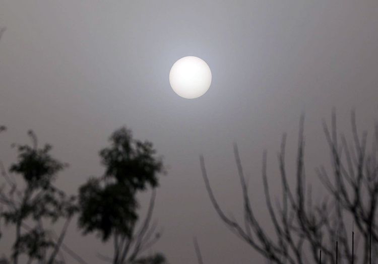 4月24日下午,中关村东路,沙尘让太阳变得朦胧。