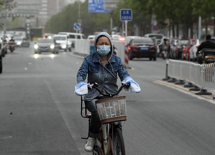 4月24日傍晚,九龙山路,市民在风沙中骑行。