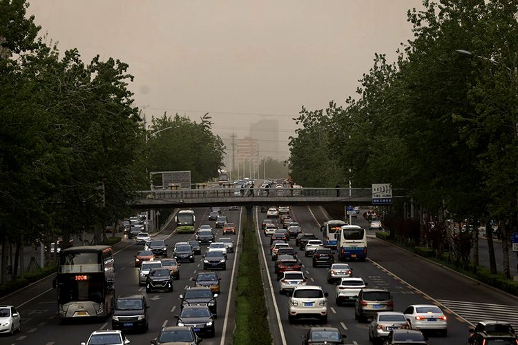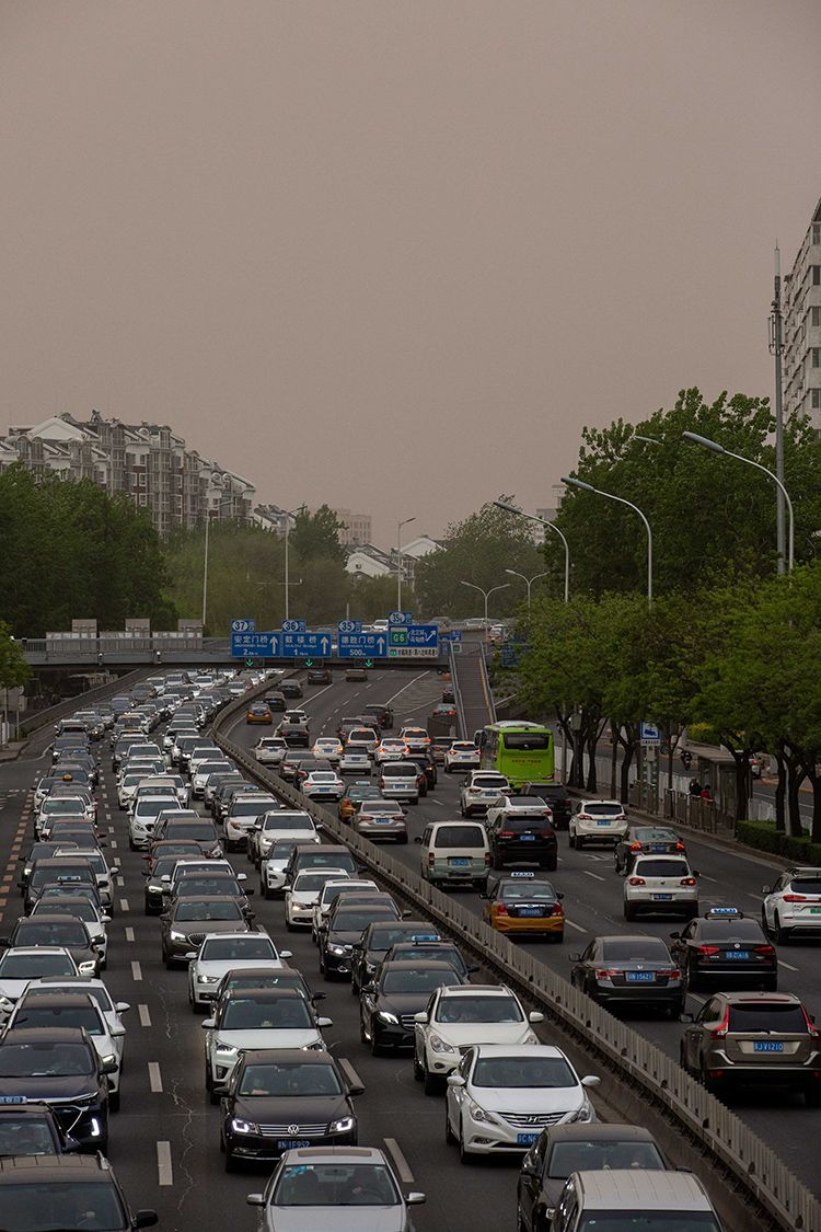 4月24日傍晚,北二环,沙尘加剧了周末晚高峰的交通压力。