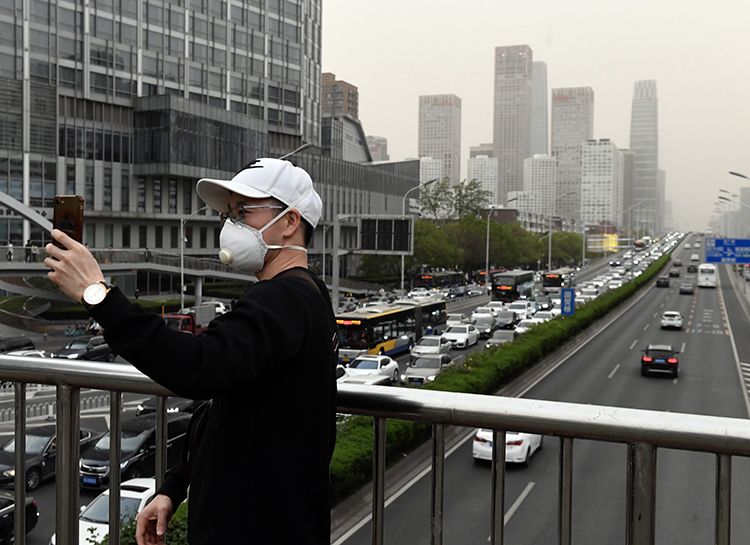 4月24日傍晚,东三环双井桥北的过街天桥上,一位市民自拍。