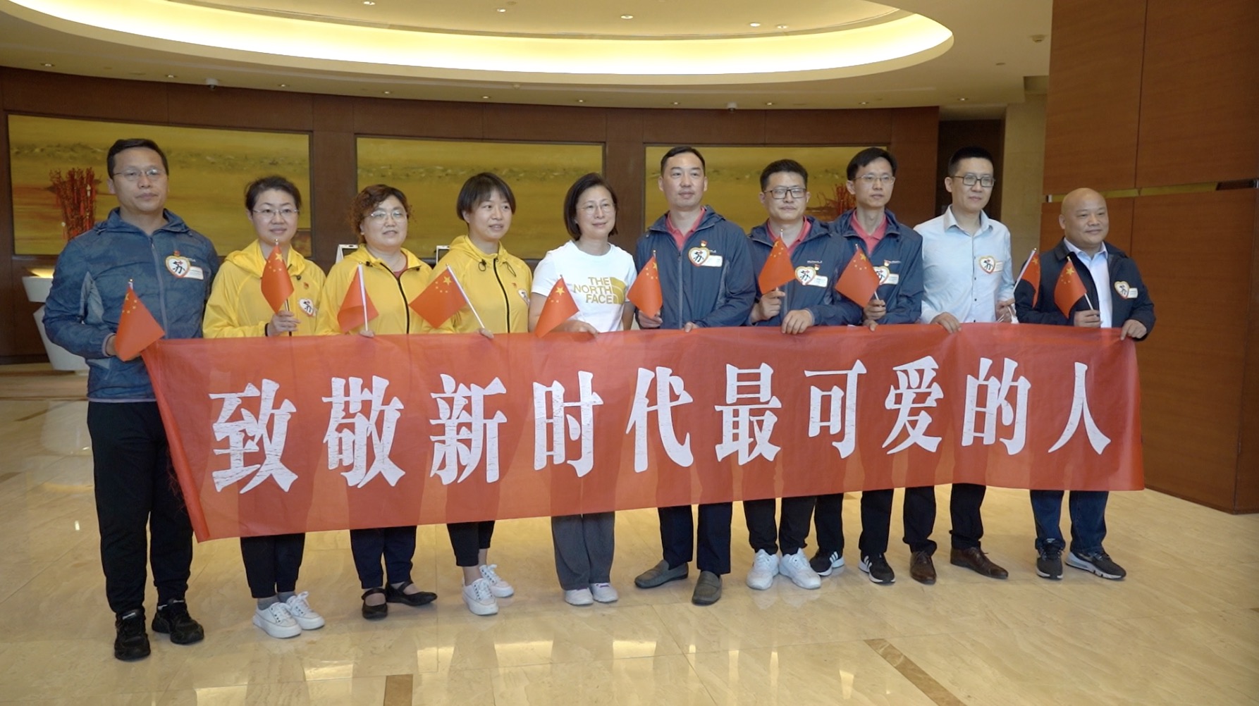 4月26日,郑瑞强(右一)、齐栩(右五)和医护人员合影留念。新京报记者 汤文昕 摄