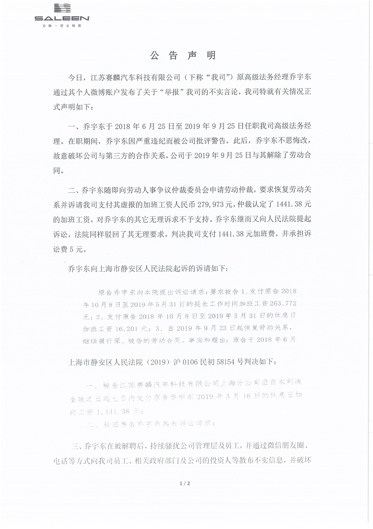 赛麟汽车在公告中称,乔宇东于2018年6月25日至2019年9月25日任职江苏赛麟汽车科技有限公司高级法务经理,后因“严重违纪”和“破坏公司与第三方合作关系”被江苏赛麟解除劳动合同。