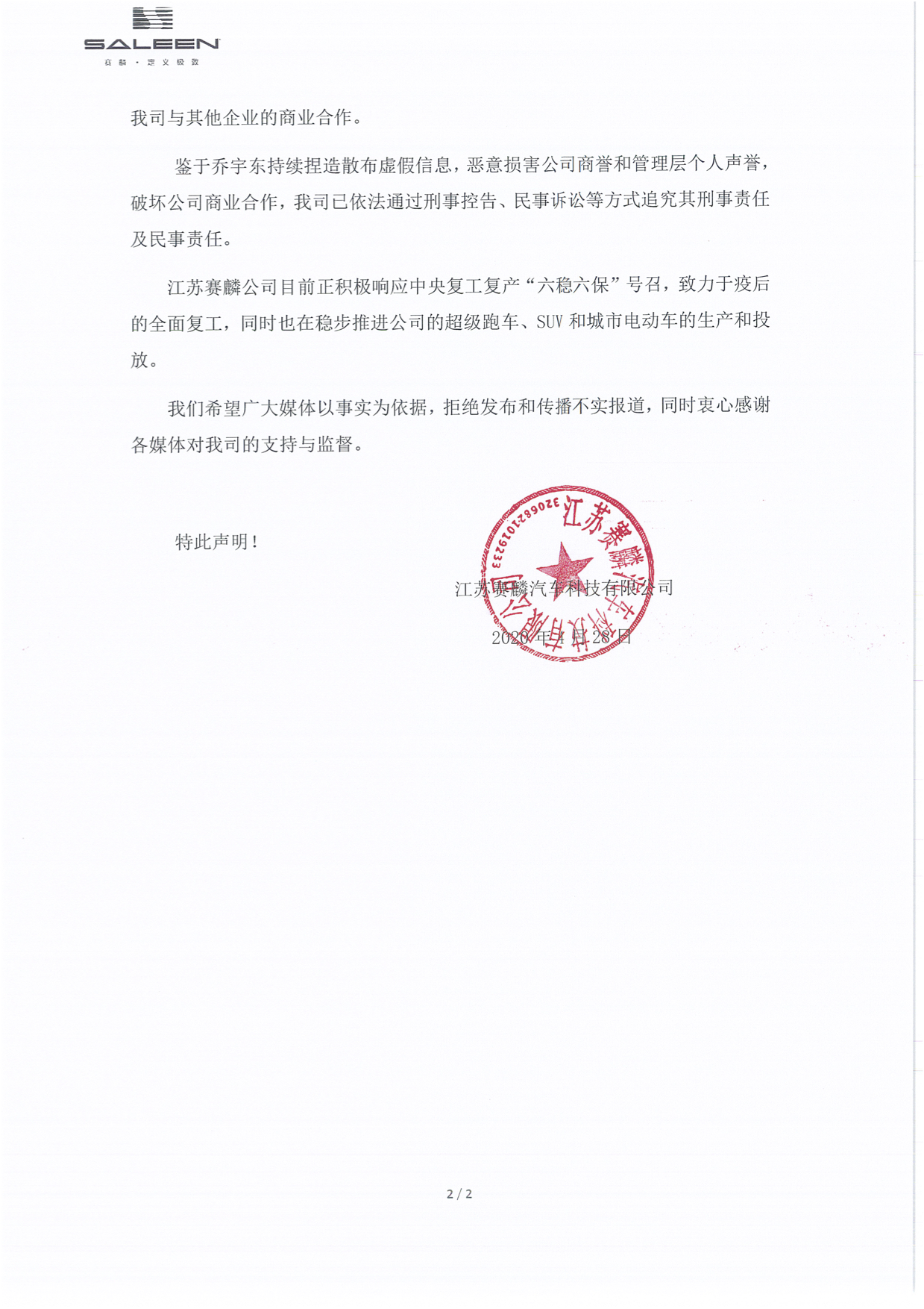 新京报讯(记者 王琳琳)4月28日,江苏赛麟汽车科技有限公司(简称“赛麟汽车”)回应其原高级法务经理乔宇东实名举报,称“乔宇东持续捏造散布虚假信息,恶意损害公司商誉和管理层个人声誉,破坏公司商业合作,已经通过刑事控告、民事诉讼等方式追究其刑事及民事责任。”
