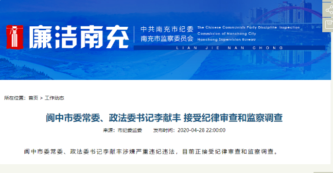 南充阆中市政法委书记李献丰被查了——据南充市纪委监委4月28日晚消息,阆中市委常委、政法委书记李献丰涉嫌严重违纪违法,目前正接受纪律审查和监察调查。