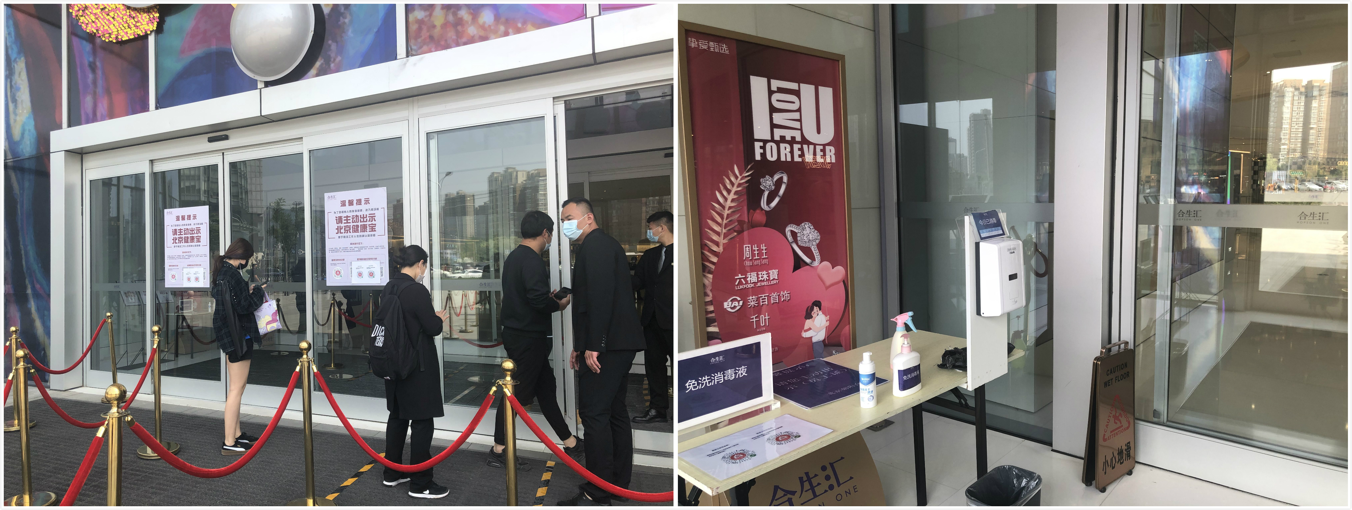 尽管疫情逐渐好转,但商场的防疫工作丝毫没有放松。合生汇相关负责人告诉新京报记者,朝阳合生汇目前营业时间为每日10时至22时,商场客流已恢复到正常水平的60%。现在商场的主要出入口是西南门和正南门,每个门口以及停车场入口,均有工作人员现场测温。并在入口设置海报提示大家主动出示“北京健康宝”,顾客需要登录微信或支付宝,在“北京健康宝”中找到“健康码”,经工作人员验证后方能进入商场。而客流较多时,工作人员则会指挥疏导大家排队验码测温。此外,在入口处的桌子上还放置了消毒液,供顾客免费使用。