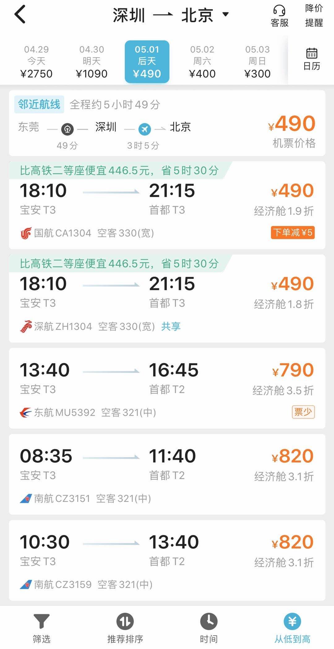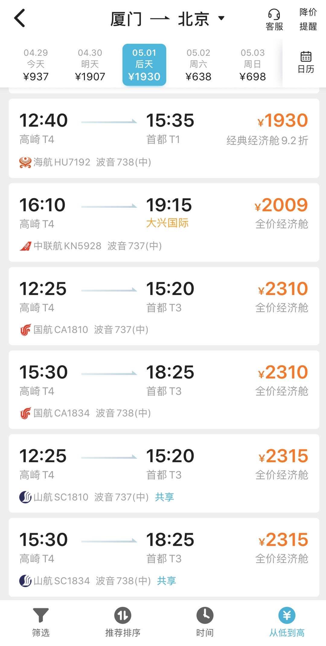 新京报记者获悉,除出京航线,入京航线热度也很高。截至目前,五一期间,昆明、成都、重庆、深圳、杭州等地至北京的进港航班还有少数1折左右的特价机票,上海、长沙、厦门等地进京航班机票折扣多在2折至3折以上,其中5月1日,厦门飞北京的直飞经济舱大都已恢复全价。