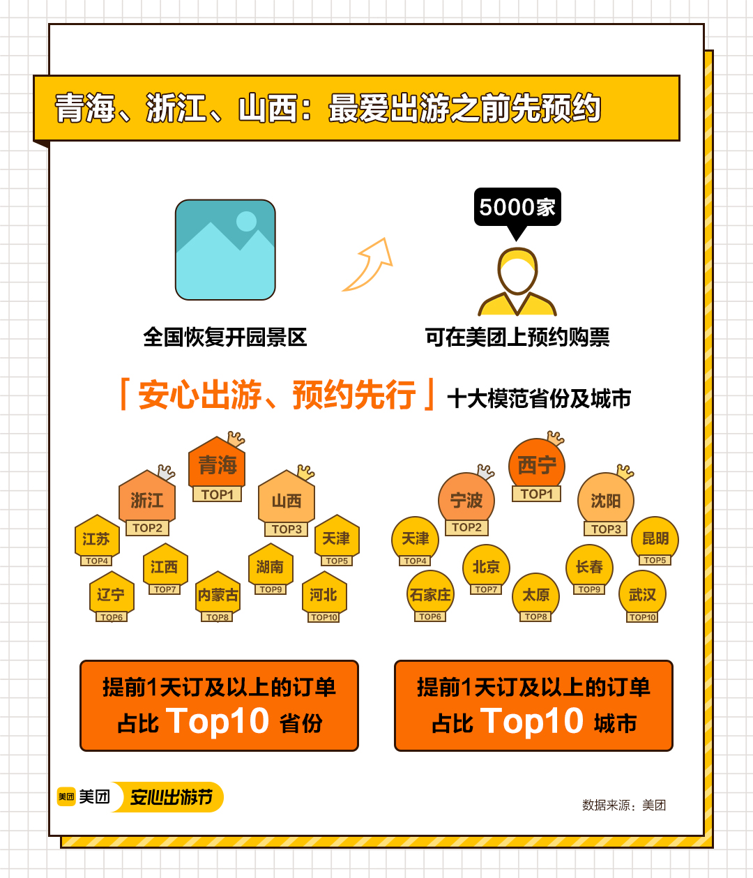 北京西山国家森林公园、八大处公园、潭柘寺、戒台寺、北京丫髻山道教文化名胜区、青龙峡、首农紫谷伊甸园等景区均已通过美团开通了“预约旅游”功能,游客可提前登录美团App进行门票预约,安排好五一期间的旅行计划。此外,北京游客“预约旅游”的习惯在全国也排名前列。4月以来的景区门票订单中,北京游客提前1天及以上的订单占比在全国主要城市中排名第7。
