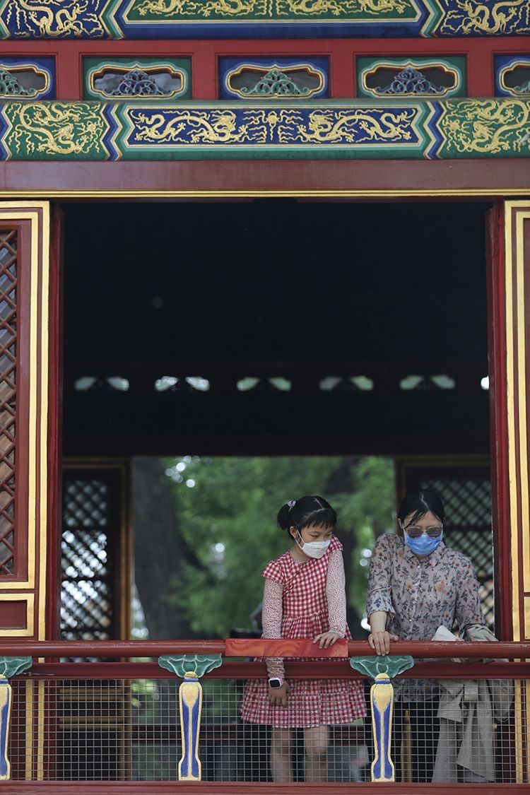 咸若馆,小朋友在楼中向外探望。摄 新京报记者 李凯祥