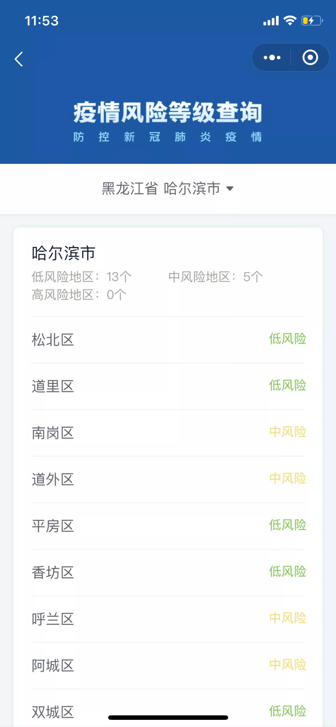 今天,知道君在疫情风险等级查询中点击黑龙江哈尔滨市,会一次性显示哈尔滨市18个地区具体风险情况,一目了然。
