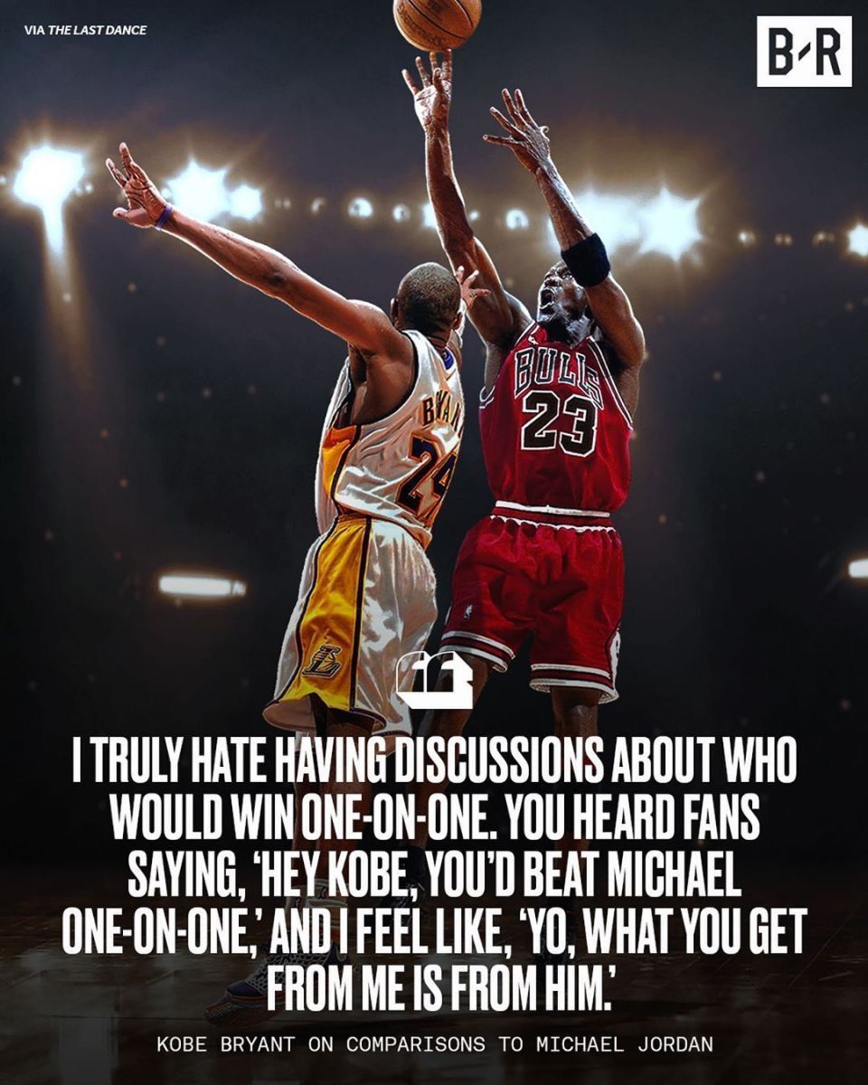 因此,科比非常讨厌外界讨论“科比和乔丹单挑谁能赢”的话题,“有的球迷会说,科比单挑能赢乔丹,我心想,我的招数都是从他那儿学的。要不是他给我那么多好建议,我赢不了5个总冠军。我能走到今天,全是因为乔丹。”