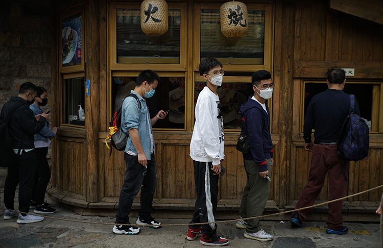 5月4日,古北水镇,游客自觉保持安全距离排队购买火烧。