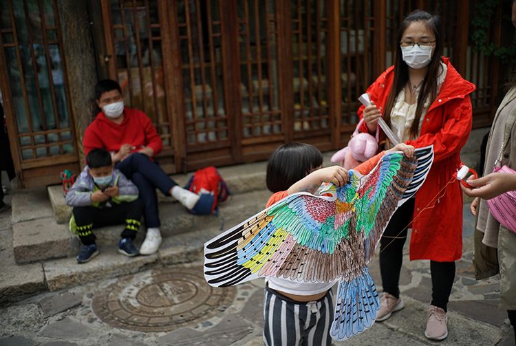 5月4日,古北水镇,一个小女孩举着风筝在景区游玩。