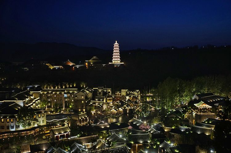 5月4日,古北水镇夜色中,圆通塔和水镇亮灯。