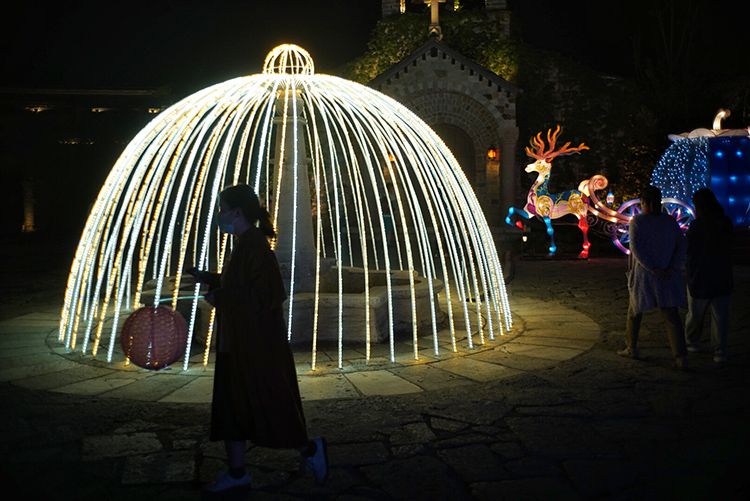 5月4日,古北水镇,一位游客在游览夜景。