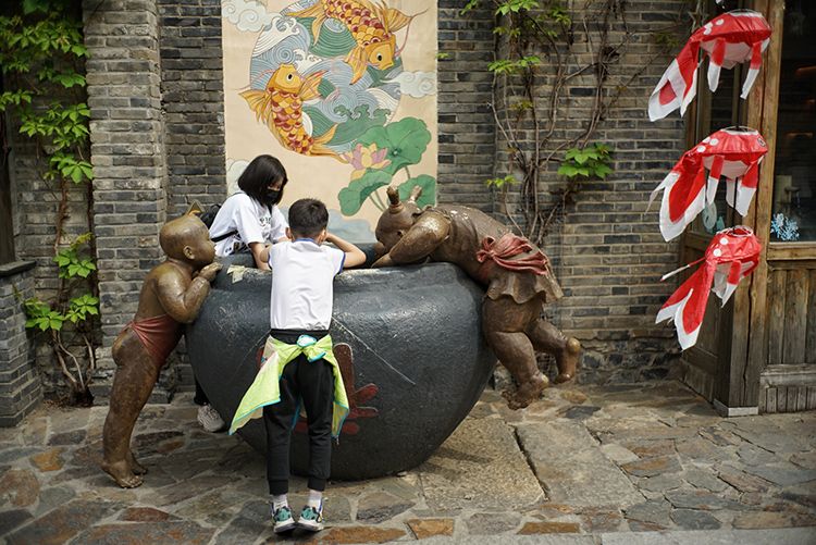 5月4日,古北水镇,两位游客趴在缸口向里张望。