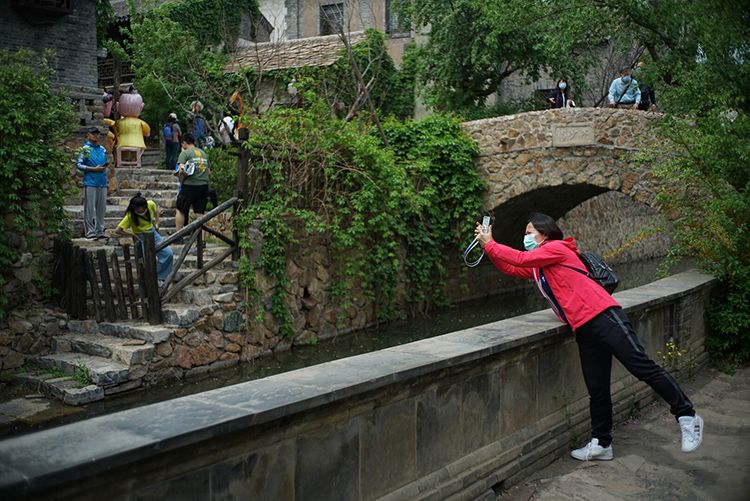5月4日,古北水镇,一位游客戴着口罩在河边拍照。
