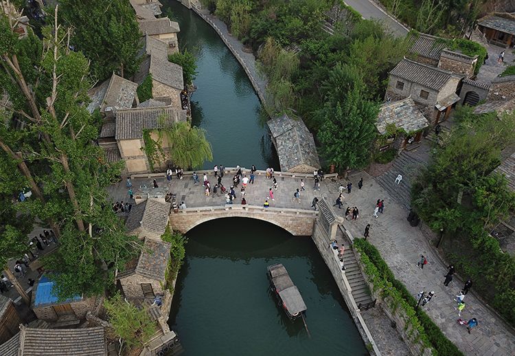 5月4日,古北水镇,游客桥上走,游船桥下过。
