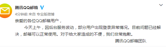 新京报快讯 6日,腾讯QQ邮箱在其官博发布致歉声明,称因后台服务波动,部分用户登录异常。目前,邮箱可以正常使用。